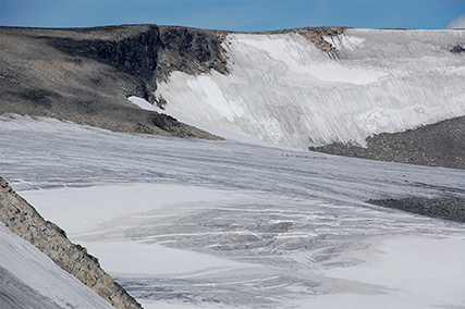 group from Juvasshytta, passing Styggebrean up towards Galdhøpiggen.