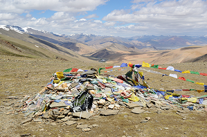 på Kyamayuru La, 5430m. Långt borta till höger syns nu åter sjön Tso